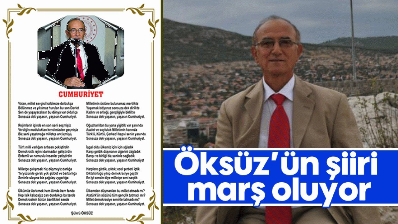 Cumhurbaşkanlığı İletişim Başkanlığı koordinasyonunda İstanbul Çekmeköy Belediyesi tarafından Cumhuriyetin 100. Yıl Marşı Yarışması düzenlendi. Çok sayıda şiir kitabı bulunan Aydın Yazarlar ve Şairler Derneği Başkanı Şükrü Öksüz de yarışmaya ‘Cumhuriyet’ isimli şiiriyle katıldı. Yarışmaya başvuran 2 bin 259 şiir arasında yapılan değerlendirme sonucunda Aydınlı yazar Şükrü Öksüz’ün şiiri ilk 100 şiir arasına girerken şiir besteleneceği öğrenildi. Öksüz, şiirin Cumhuriyetin 100. Yıl Marşı yarışmasında ilk 100’e girmesinin kendisi için büyük bir gurur kaynağı olduğunu belirterek şiirinin bestekarların emrine verildiğini söyledi.