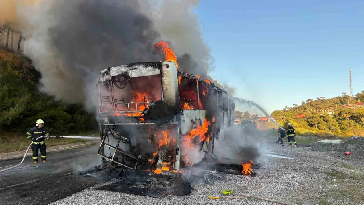 Olay, Muğla’nın Marmaris-Datça Karayolu Mezargediği mevkiinde saat 19.00 sıralarında meydana geldi. Edinilen bilgiye göre, seyir halindeki bir tur otobüsü, henüz bilinmeyen bir nedenle yanmaya başladı. Dumanları fark eden şoför aracı durdururken, yolcular ve sürücü hızla otobüsten indi.