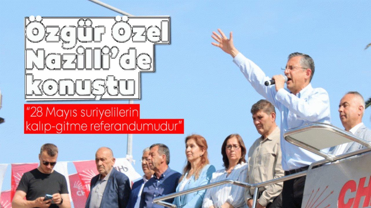 İstasyon Meydanı’ndan seçmenlere seslenen Özel, '14 Mayıs akşam halk iktidara ‘dur biraz’ dedi'. diyerek, “21 yıllık bir iktidar onun Genel Başkanı ve Cumhurbaşkanı sıfatını taşıyan Erdoğan her şeyi ben yaparım bilirim diyordu. Milletin kantarına çıktı, 14 Mayıs günü millet dur biraz dedi. Yetti artık, açlık yeter dedi. İşsizlik ve bugüne kadar çektiklerimiz yeter dedi. 1. turda mührü Erdoğan'a vermedi. Onun her konuda yaptığı yanlışları söyleyen adama verdi. 28 Mayıs'ta sandığa gidecekler, kararı verecek. İki fotoğraf olacak seçmen kağıdında.”“28 MAYIS SURİYELİLERİN KALIP GİTME REFERANDUMUDUR”