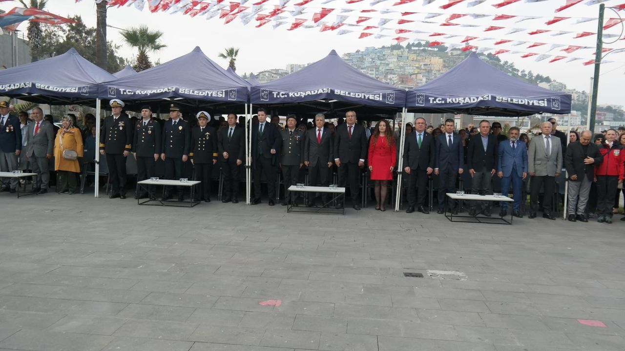 Sabah saat 10.30’da, Atatürk Anıtı’na Kuşadası Kaymakamlığı, Garnizon Komutanlığı, Kuşadası Belediye Başkanlığı ve Nazilli Şehit Aileleri Derneği tarafından çelenk konulmasıyla başlayan tören, saygı duruşunda bulunulması ve İstiklal Marşı’nın okunmasıyla devam etti.