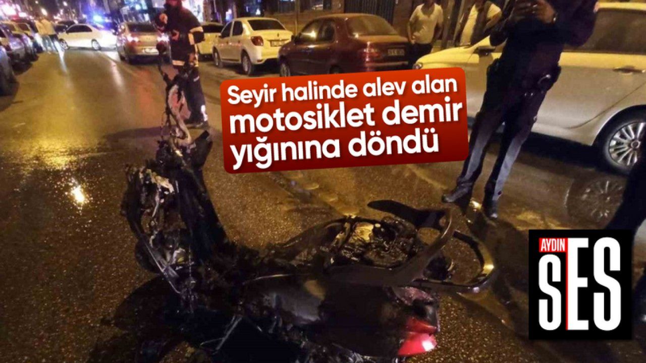 Aydın’ın Efeler ilçesinde meydana gelen olayda seyir halindeki motosiklette çıkan yangın panikletirken, motosiklet demir yığınına döndü.