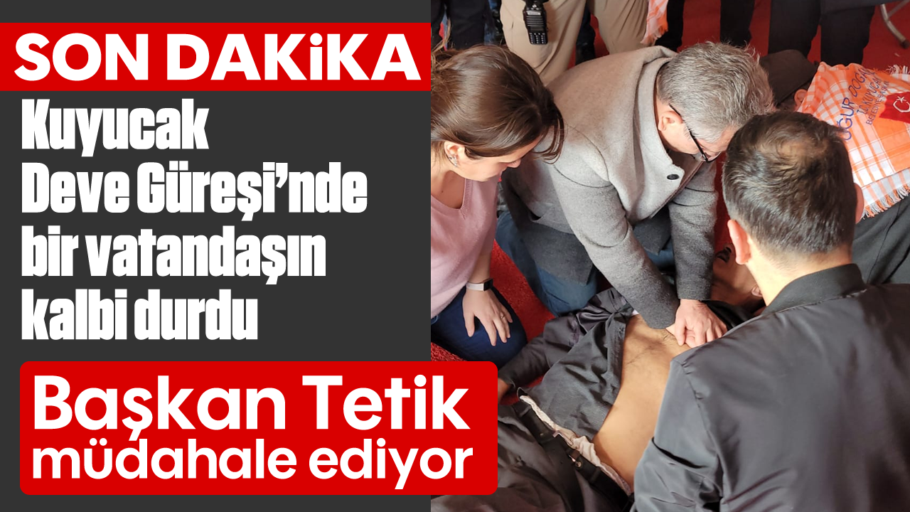 Aydın’ın Kuyucak ilçesinde düzenlenen deve güreşinde Kuyucak CHP İlçe Yöneticisi Ömer G. isimli vatandaş, protokol tribününde oturduğu esnada fenalaştı. Yere yığılan Ömer G.’nin kalbi durdu. Kalbi duran Ömer G.’ye, deve güreşi alanında bulunan Nazilli Belediye Başkanı Doktor Ertuğrul Tetik ilk müdahaleyi yaptı. Kalp masajı ile vatandaşı geri döndüren ve uzun uğraşlar sonucu nabzı geri alan Başkan Tetik, bölgeye ambulans talep etti.