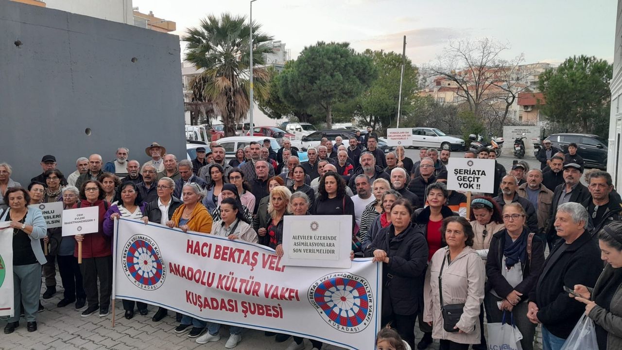 Hacı Bektaş Veli Anadolu Kültür Vakfı (Cemevi) Kuşadası şubesi önünde düzenlenen basın açıklamasına Hacı Bektaş Veli Anadolu Kültür Vakfı Kuşadası şube Başkanı Erdal Kılınç ve üyelerin yanı sıra siyasi parti, dernek, sivil toplum kuruluşları temsilcileri ve vatandaşlar yoğun katılım gösterdi.