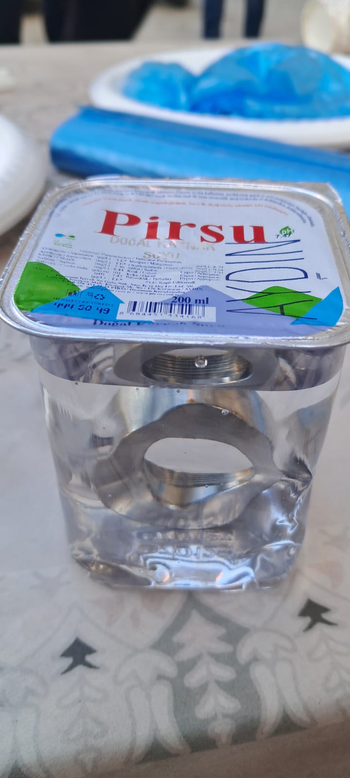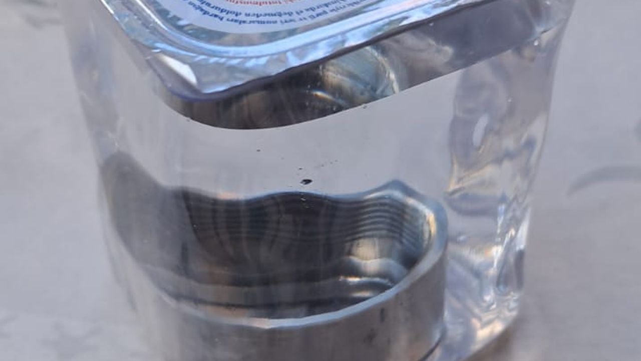 Nazilli’de bir taziye evinde misafirlere ikram edilmek üzere sipariş edilen paketli bardak su, görenleri şaşkına çevirdi. İkram sırasında bir bardak suyun içerisinde yabancı madde olduğunu fark eden vatandaşlar, yaptıkları incelemede suyun içinde cıvata bobini (manşon) bulunduğunu gördü.