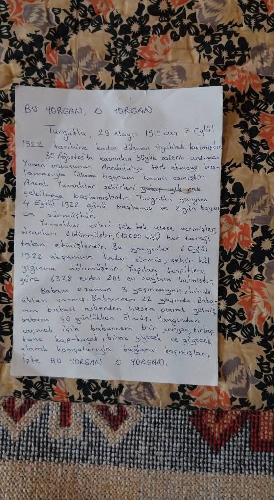 Nazilli’de yaşayan kültürel miras taşıyıcısı ve emekli sınıf öğretmeni Nihal Erbakan, o acı günlerin hikâyelerini babaannesinden dinleyerek büyüdü. Bugün evinde özenle sakladığı yorgan, sadece bir aile yadigârı değil; aynı zamanda bir dönemin tanığı. Erbakan, babaannesinin yorganla birlikte verdiği yaşam mücadelesini duygulanarak şöyle anlatıyor: “Babaannem anlatırdı; babam o zaman 3 yaşındaymış, bir de ablası varmış. Babaannem 22 yaşındaymış. Dedem askerden döndüğünde hastalanmış, babam daha 40 günlükken vefat etmiş. Yangınlar başlayınca babaannem bir yorgan, biraz yiyecek ve giyecek alarak komşularıyla birlikte bağlara kaçmış. O zaman bir ahıra sığınıp babamı o yorgana sarmış. O yorgan o günden bugüne geldi, bende bana verilen emanete gözüm gibi bakıyorum.”