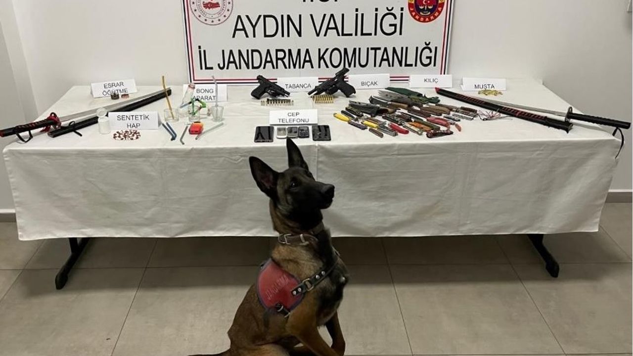 B.A. (42) ve N.Y. (32) isimli şüphelilere ait ikametlerde, Jandarma Komando Timi ile narkotik ve bomba arama köpeklerinin katılımıyla adli arama gerçekleştirildi. Titizlikle yapılan aramalarda adeta cephanelik ele geçirildi. Şüphelilerin adreslerinde yapılan aramalarda 51 adet sentetik hap, 2 adet bong aparatı, 2 adet tabanca, 59 adet fişek ve 3 şarjör, 25 adet sustalı bıçak, 2 adet samuray kılıcı, 1 adet muşta ve 5 adet cep telefonu ele geçirildi.