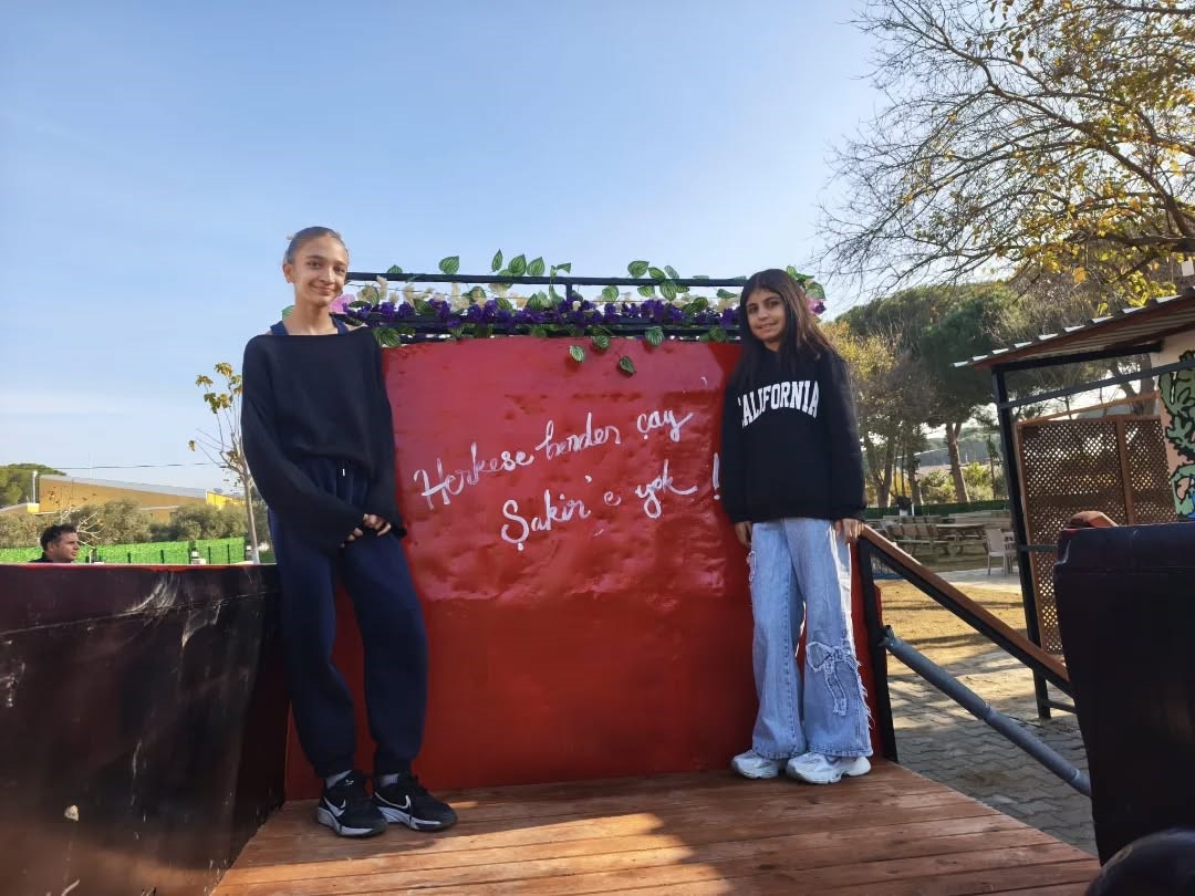 Germencik Belediyesi işletmesi Sini Kahvaltı Evi bahçesinde yerini alan kırmızı Çiçek Abbas minibüsü, üzeri çiçeklerle süslenmiş görünümü ve içine yerleştirilen basamaklarla minik ziyaretçiler için güvenli bir oyun alanı haline getirildi.