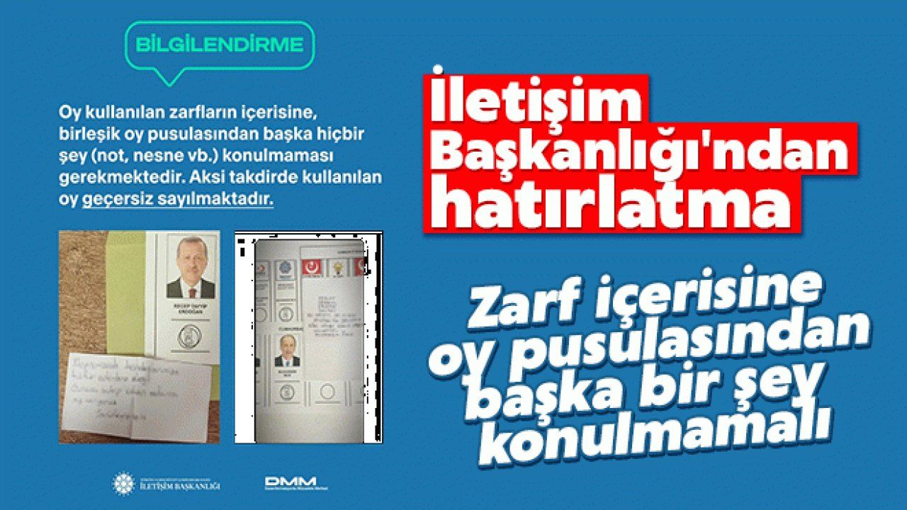 Oyların geçersiz sayılmaması için zarfların içine birleşik oy pusulası dışında hiçbir şeyin konulmamasını istedi.