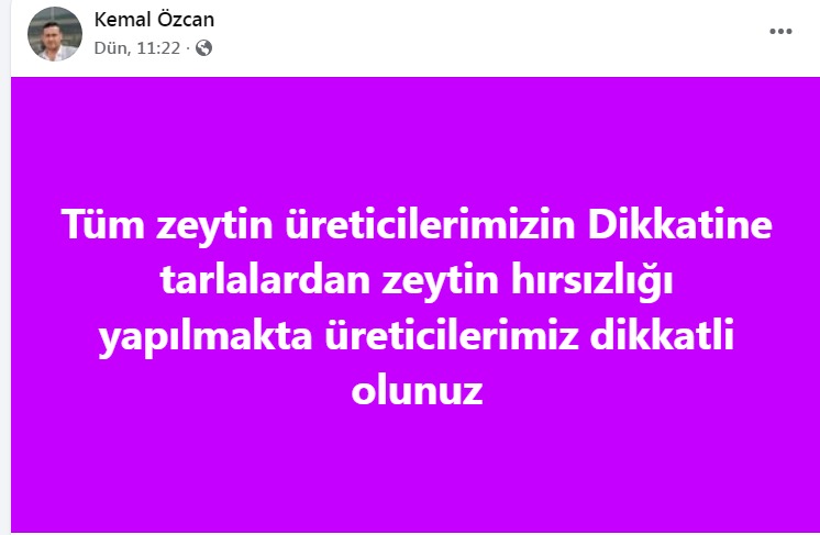 Bozdoğan Ziraat Odası Başkanı Kemal Özcan, sosyal medya hesabından yaptığı duyuruda şu ifadeleri kullandı; “Tüm zeytin üreticilerimizin dikkatine; ilçemizde bahçelerden zeytin hırsızlığı yapılmaktadır. Üreticilerimiz daha dikkatli olsun.” Geçmiş yıllarda özellikle incir bahçelerinde sıkça karşılaşılan hırsızlık olaylarının, bu sezon zeytinliklere sıçraması üreticilerde endişe yarattı. Henüz hasat edilmemiş zeytinlerin gece saatlerinde çalındığına yönelik ihbarların arttığı bildirildi.
