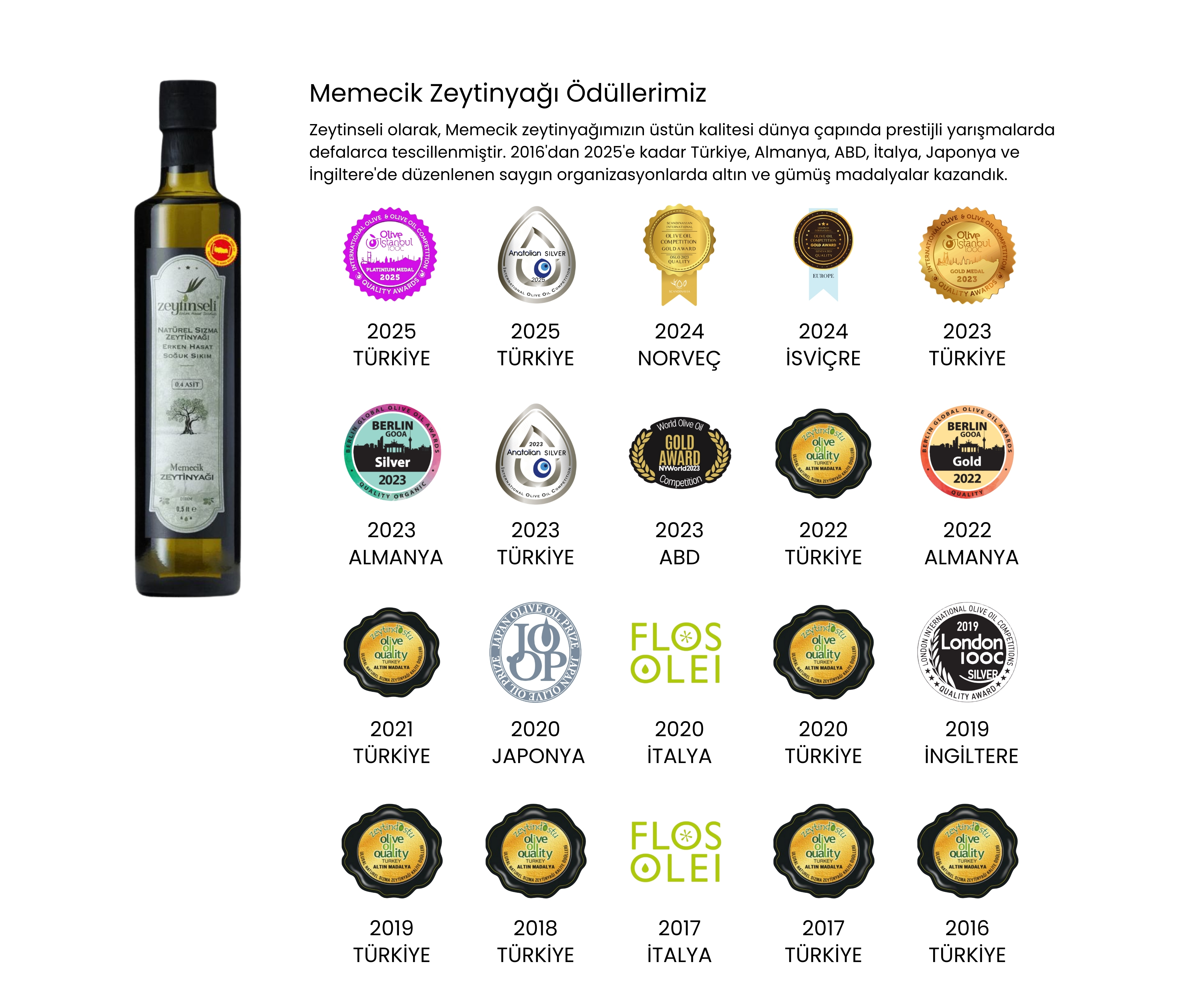 Zeytinseli, 2021 yılında İtalya’da düzenlenen BIOL XXVI International Prize yarışmasında “Best Olive Oil of Turkey” (Türkiye’nin En İyi Organik Zeytinyağı) unvanıyla ödüllendirildi. Ayrıca, dünyanın en prestijli zeytinyağı rehberlerinden biri olan FLOS OLEI – A Guide to the World of Extra Virgin Olive Oil albümüne 2016, 2017 ve 2020 yıllarında üç kez seçilerek dünyanın en iyi 500 markası arasında yer aldı.